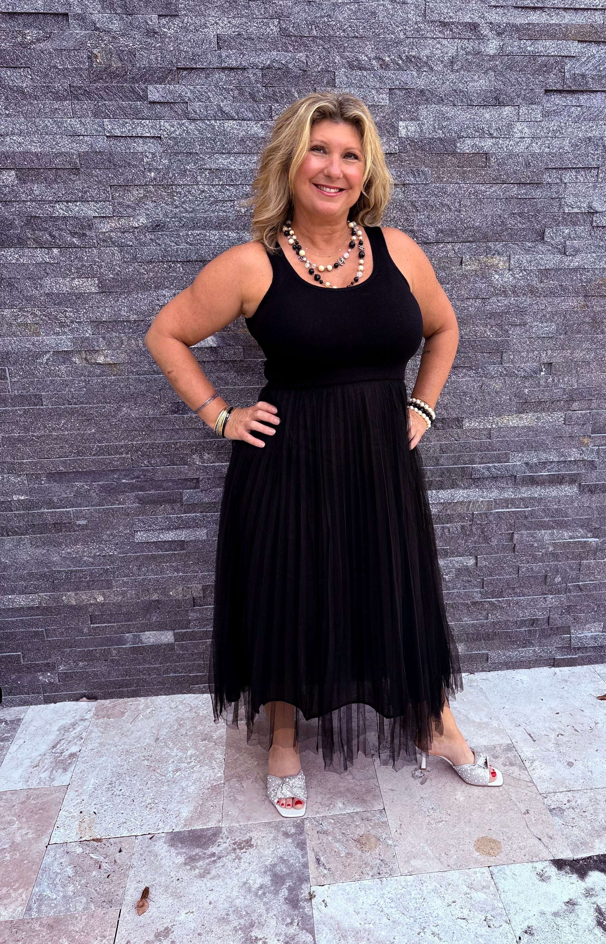 Unleash your inner ballerina with the Black Tulle Tank Maxi Dress by Elan. Enjoy the comfort of its stretchy top while looking elegant in the full length maxi skirt with tulle overlay. Perfect for any occasion.