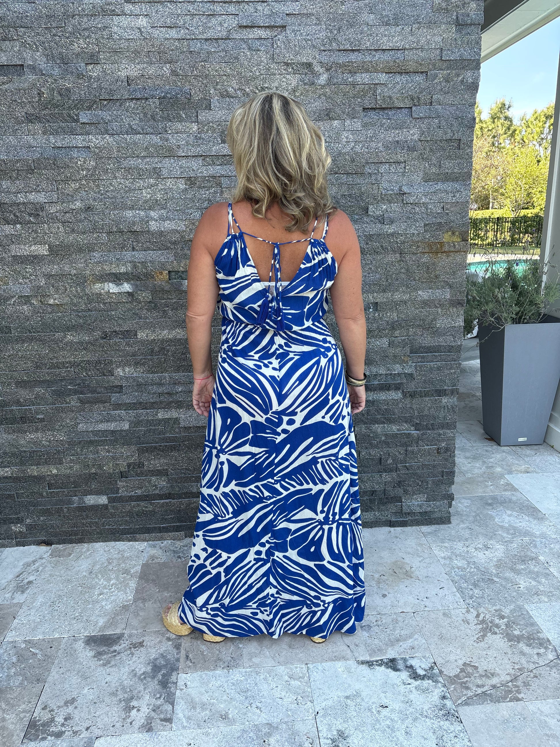 The Blue Floral Maxi by Elan features a long, floaty silhouette complemented by a striking blue and white floral design. Its adjustable string straps provide a customizable fit, allowing for versatility from daytime to evening wear. This dress merges comfort with elegance, making it ideal for various occasions.