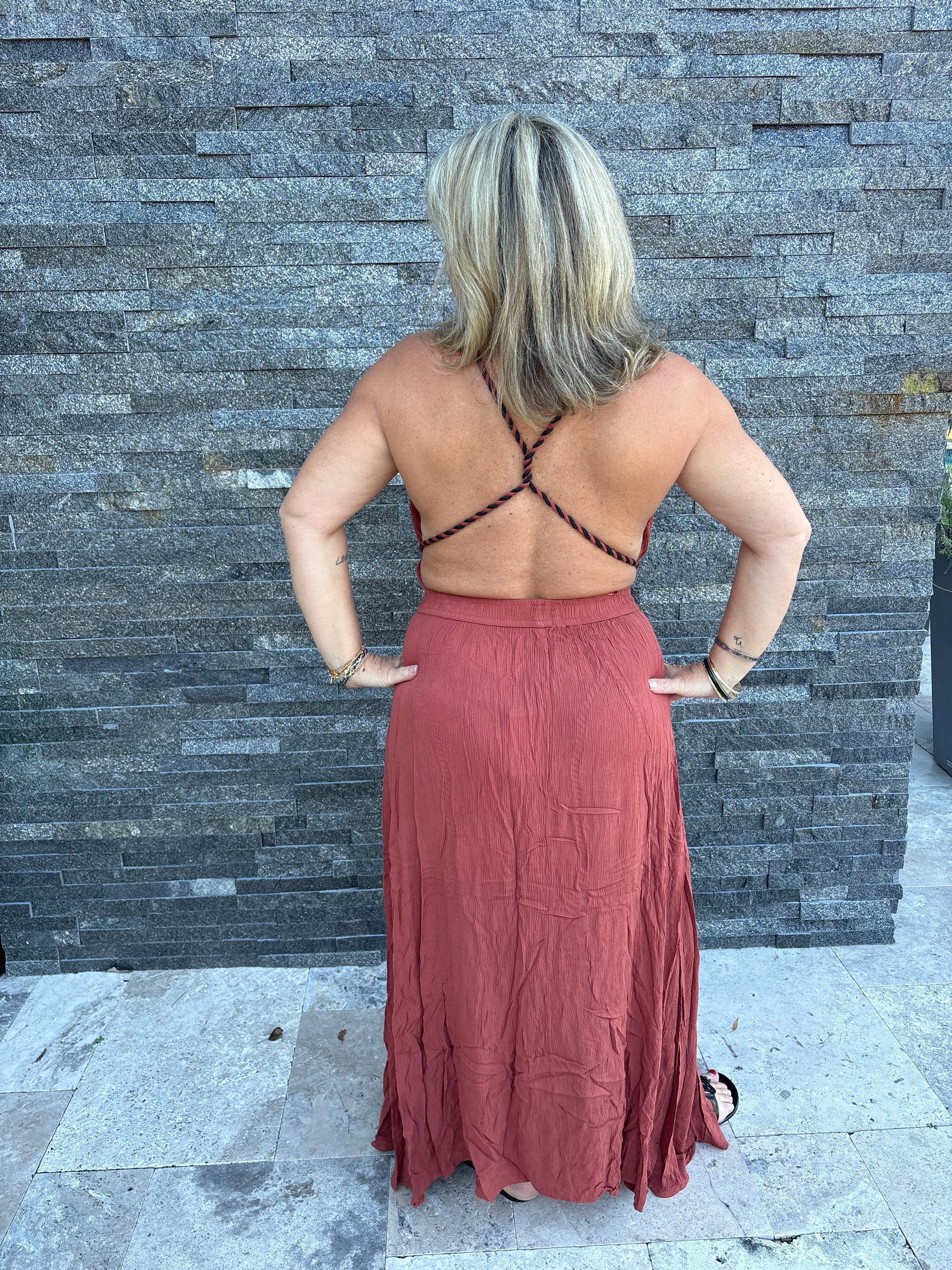 Boho Grecian dress by ElanThe Elan Boho flowy dress features a versatile backless design with adjustable rope straps, allowing for multiple styling options. Ideal for transitioning from day to night, this dress combines comfort with a chic aesthetic, making it suitable for various occasions.