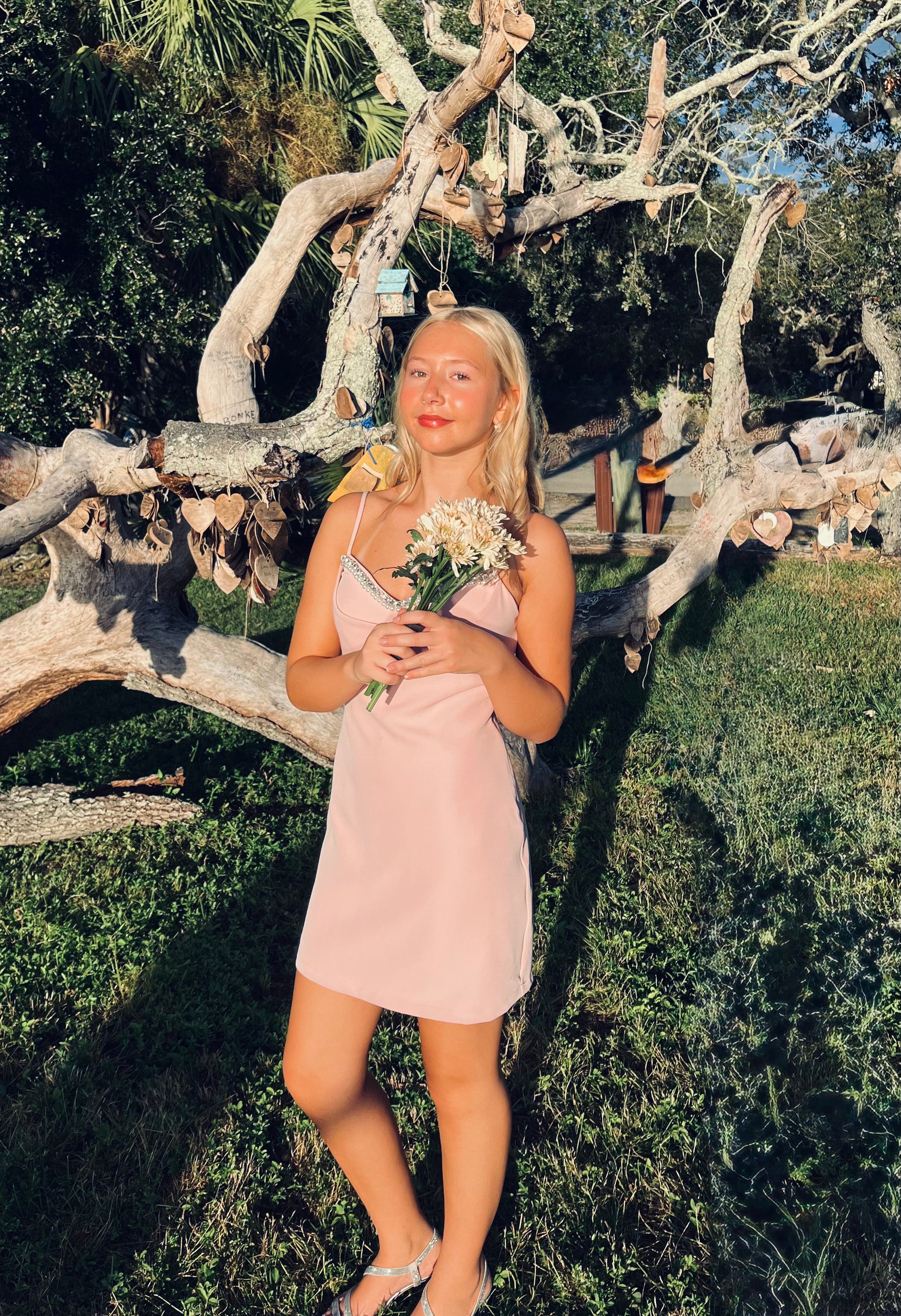 Adjustable spaghetti straps. Dusty rose, pink colored, mini dress. Rhinestone detail on the bust.